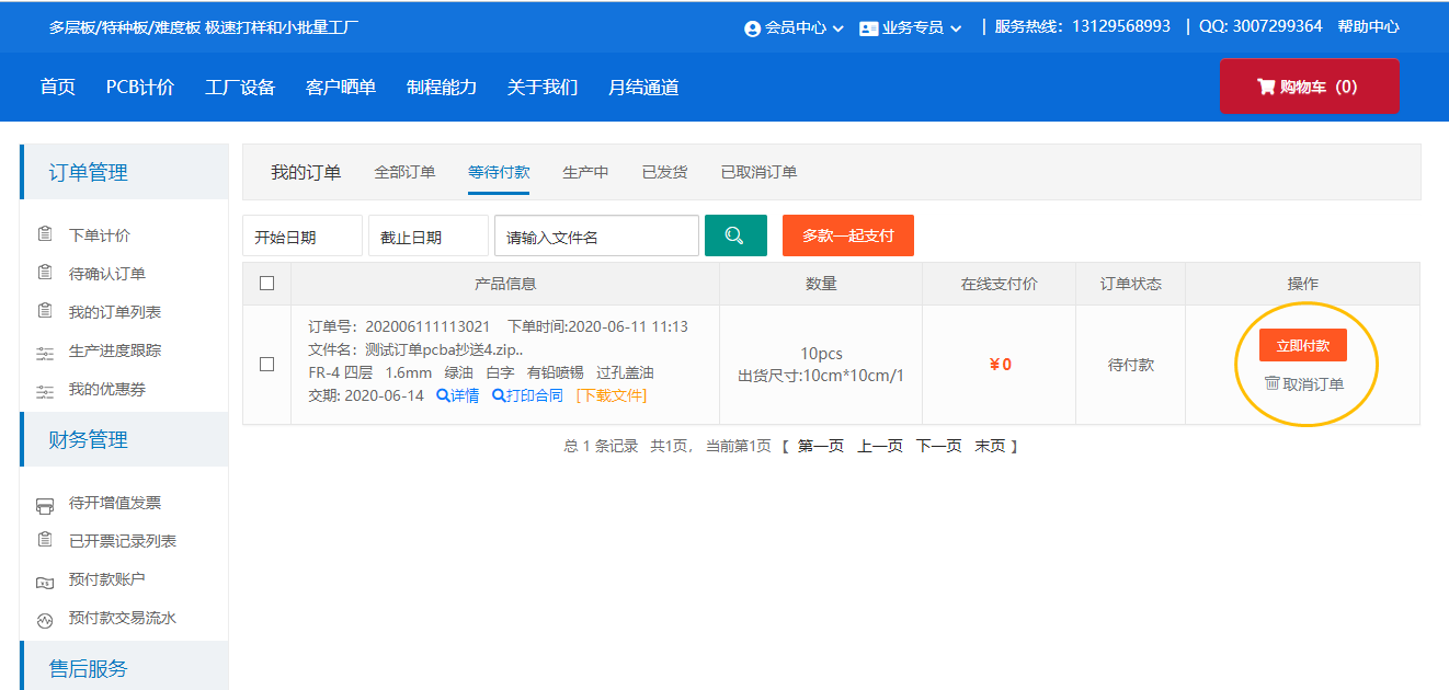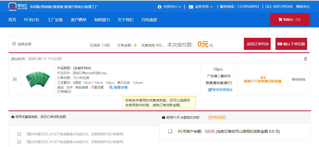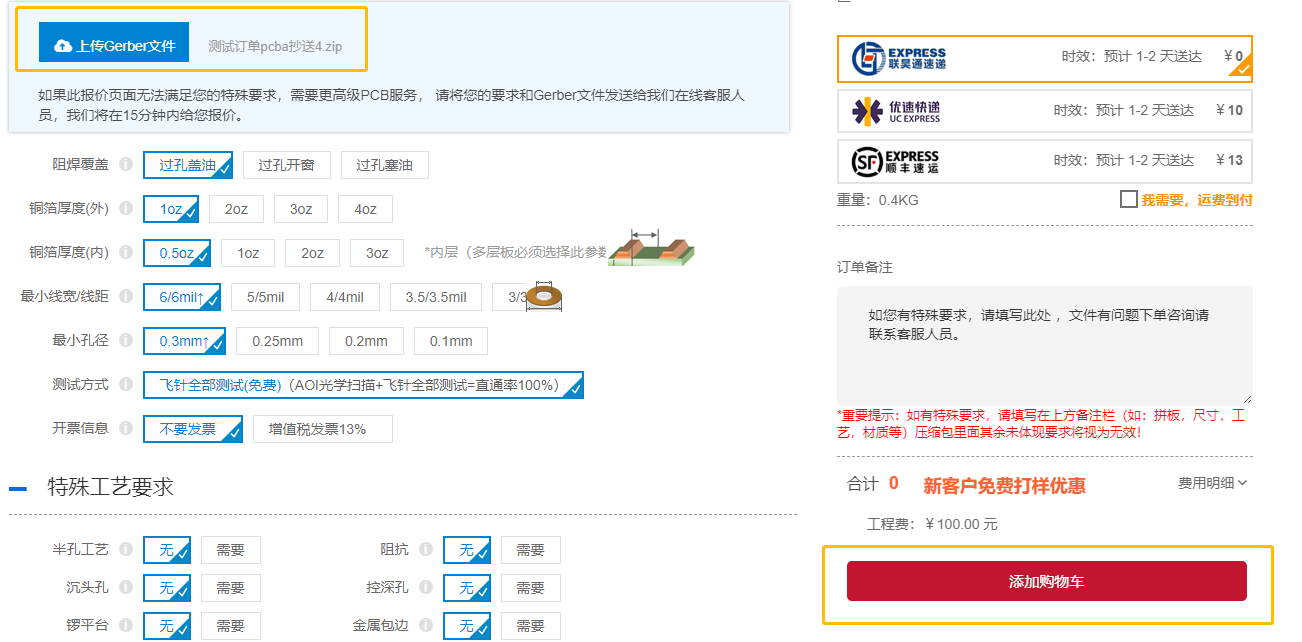 上傳PCB文件,完善收貨地址信息,添加購物車完成下單。
