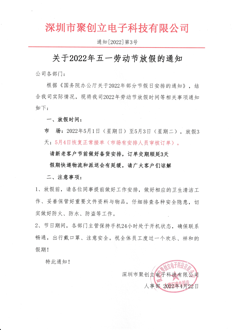 根據(jù)《國(guó)務(wù)院辦公廳關(guān)于2022年部分節(jié)假日安排的通知》,結(jié)合我司實(shí)際情況,現(xiàn)將我司2022年勞動(dòng)節(jié)放假時(shí)間等相關(guān)事項(xiàng)通知如下: